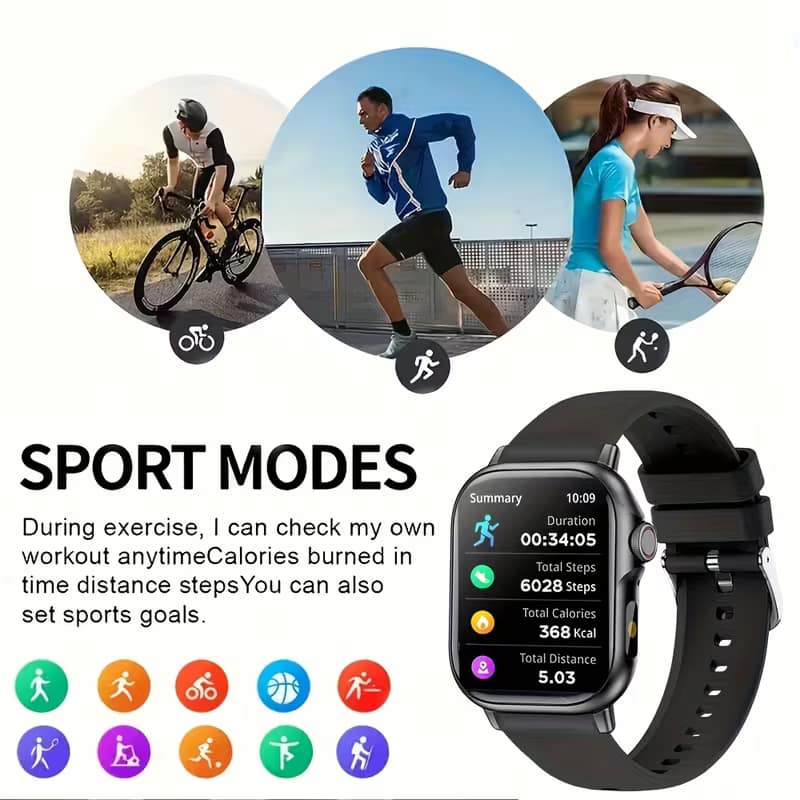 For fitness and activity tracking, the smartwatch includes multiple sports modes and a stopwatch, making it suitable for workouts, training, and general activity monitoring. Compatible with most smartphones, it offers a balanced mix of style, functionality, and convenience in one smart wearable.